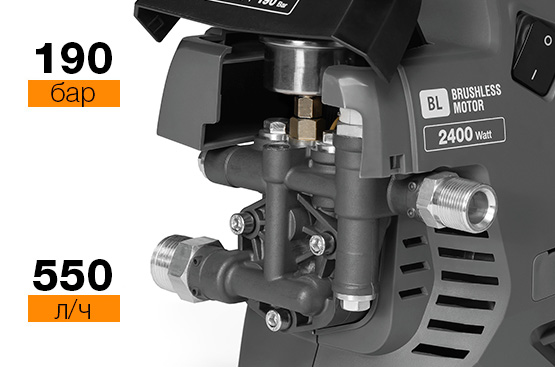 Алюминиевая помпа обеспечивает высокое давление и более устойчива к напорным нагрузкам и износу, в отличии от пластиковых аналогов. При этом алюминий не подвержен коррозии, обеспечивает эффективный отвод избыточного тепла от двигателя и продлевает срок службы мойки. Для удобной замены масла предусмотрено отверстие на боковой панели мойки.